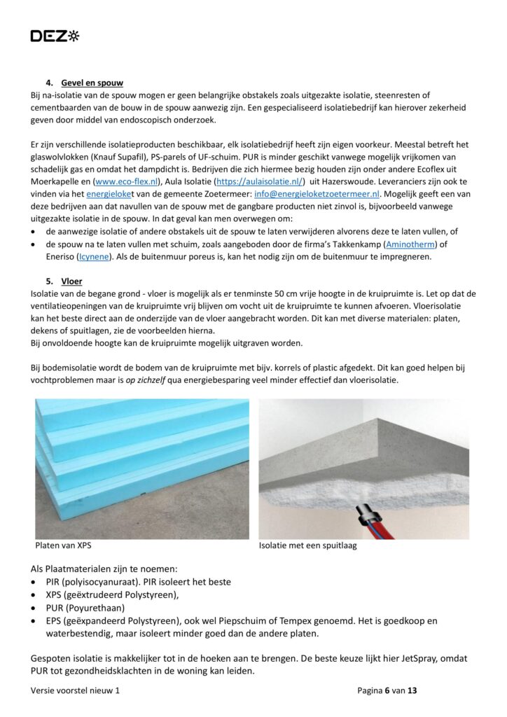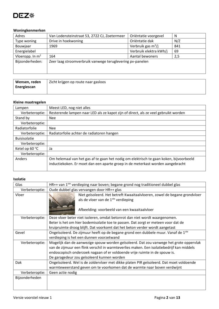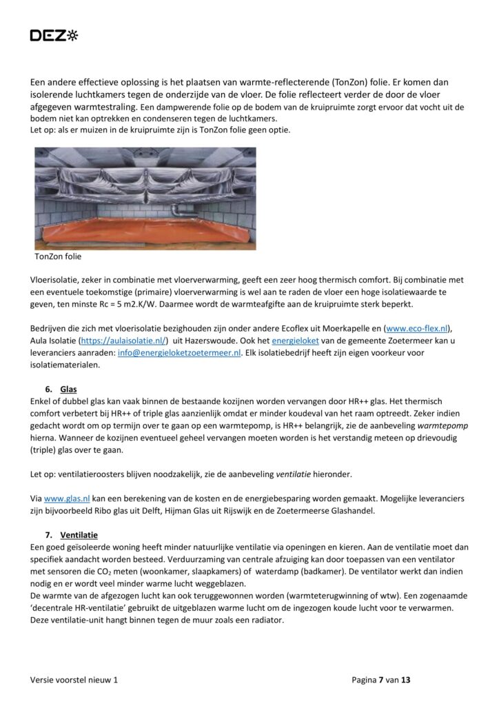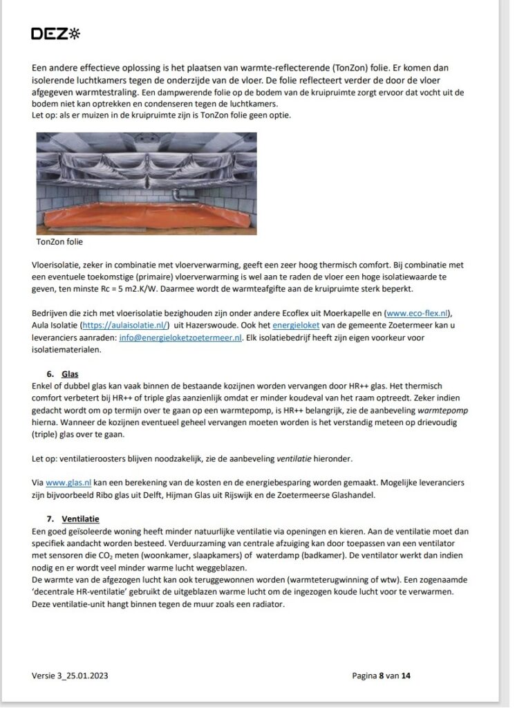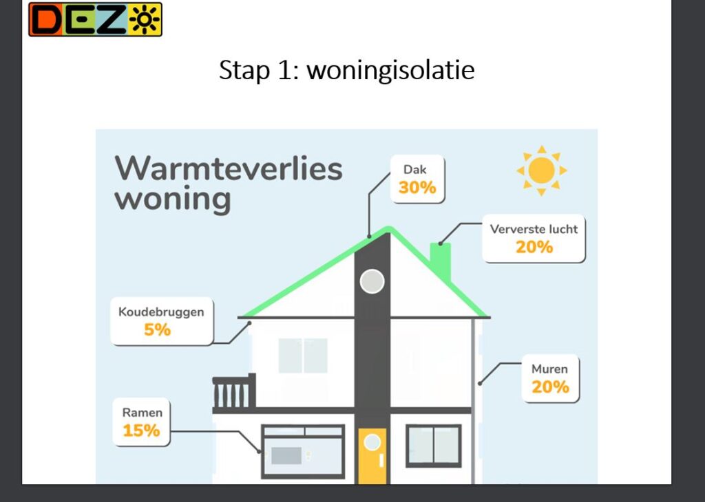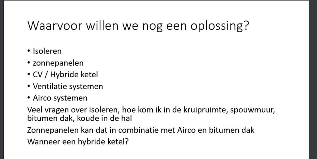Aan de orde komen hoe zuiniger om te gaan met energie en het voorbereiden hoe t.z.t. gasloos te worden ; klimaat beheersing in de woning bij isoleren en wat meer ter tafel komt.